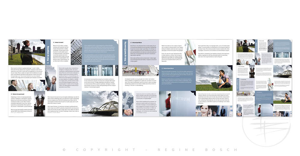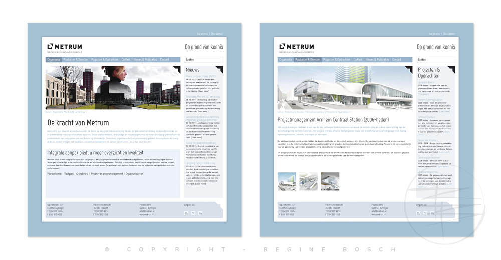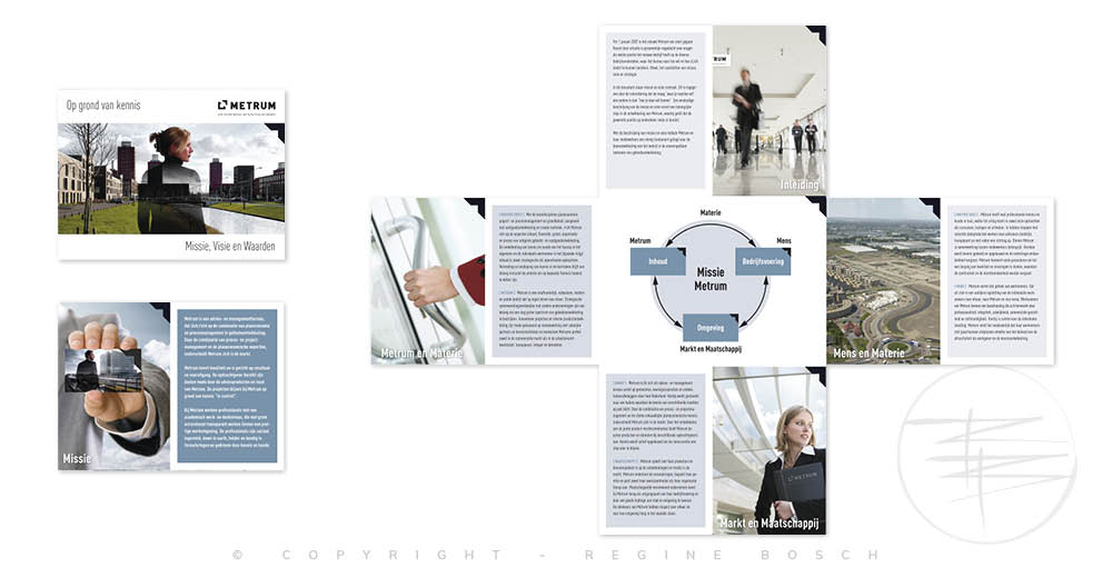 Metrum Diverse ontwerpen voor flyers, folders etc. Alles in de bestaande huisstijl waarbij is gespeeld met de diverse grafische elementen, zodat het een afwisselend beeld is maar toch het zakelijke karakter bewaard blijft.