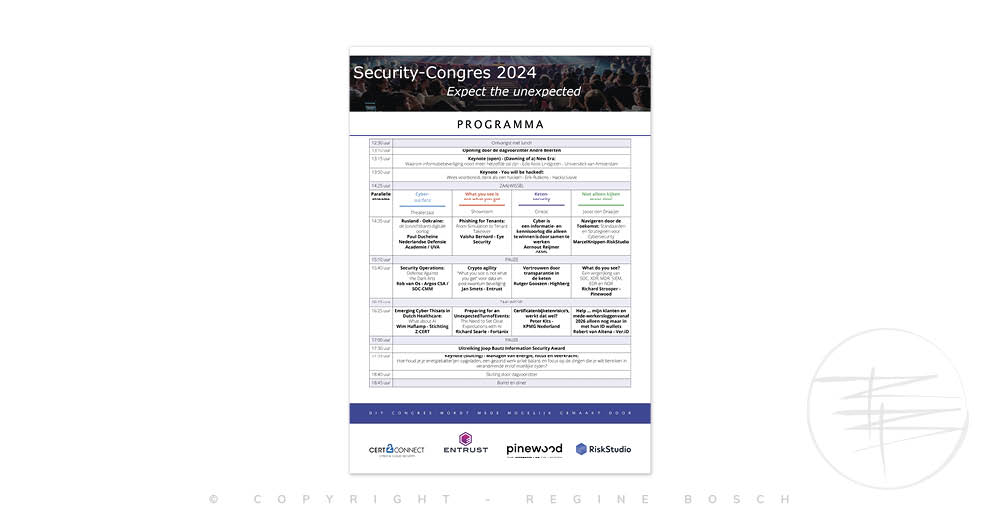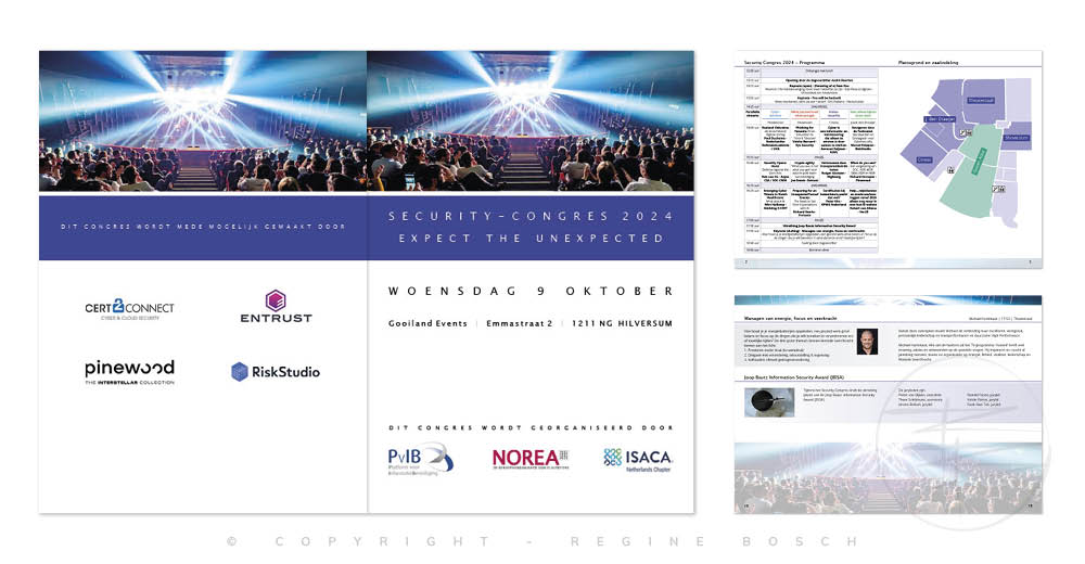 Security Congres Security Congress is een organisatie die conferenties organiseert om cyberbeveiligingsmaatregelen te verbeteren. Jaarlijks maak ik hun programmaboekje en posters voor de conferentie, in hun bestaande huisstijl.